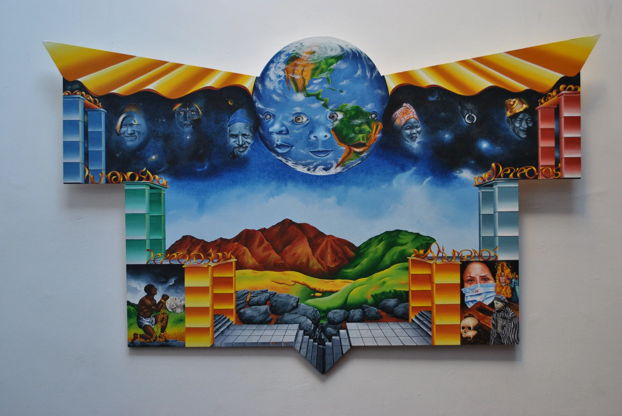 Human Rights La Paz, Bolivia / 3’-3” X 3’-3” / Medium: Acrylic on wood / 2010 This painting was commissioned by a Human Rights activist in Bolivia. She was very instrumental in holding the Bolivian Government accountable for various forms of Human Rights abuse prior to Evo Morales government. Her name was Miriam Campos , we partnered for various Art Projects that involved different indigineous communities.
