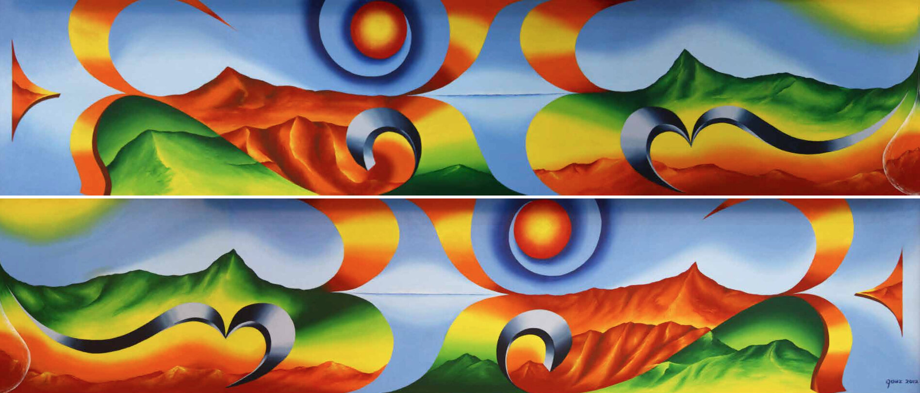 Bending The Real To Satisfy The Mind : Distorting These beautiful Landscapes to create new spaces was the exercise for this painting. Mix Media / Doryan Café Bolivia / 9’-8” X 2’ 2” / Medium: Acrylic on wood / 2019