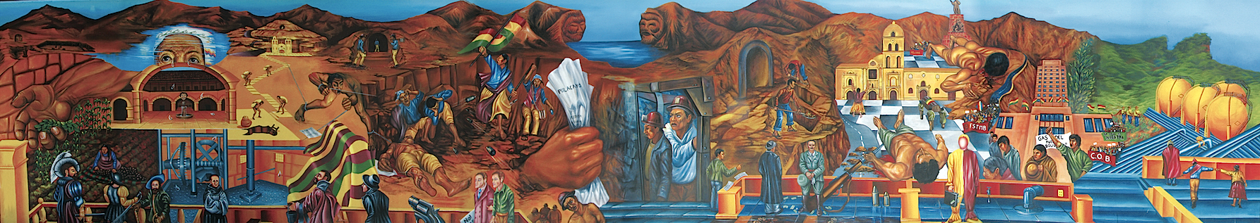 The mural is a sweeping visual narrative of the centuries-long exploitation and subjugation of the Bolivian people, beginning with the arrival of the Spanish conquistadors. Through layered imagery and symbolic figures, it traces the brutal legacy of colonization—from the extraction of silver from Potosí’s mines under enslaved Indigenous labor, to the continued economic and political disenfranchisement of Bolivia’s Indigenous majority.