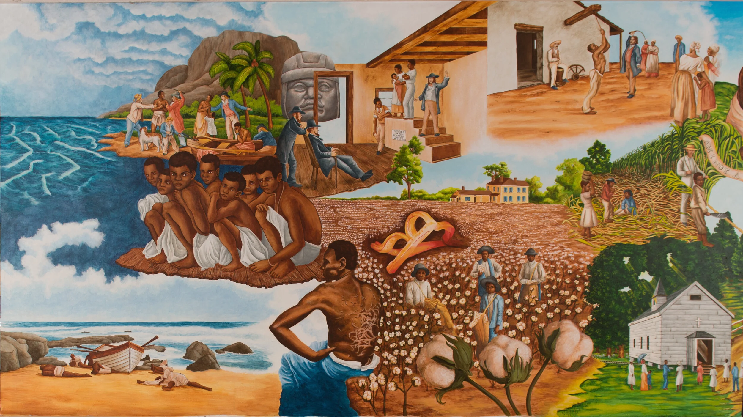 This section bears witness to one of the most harrowing chapters in human history: the transatlantic slave trade. It depicts the violent rupture from homeland to forced displacement, focusing on the Middle Passage—the horrific sea journey endured by millions of captured Africans. Cramped, shackled, and dehumanized aboard slave ships, an estimated one-third perished before even reaching shore.